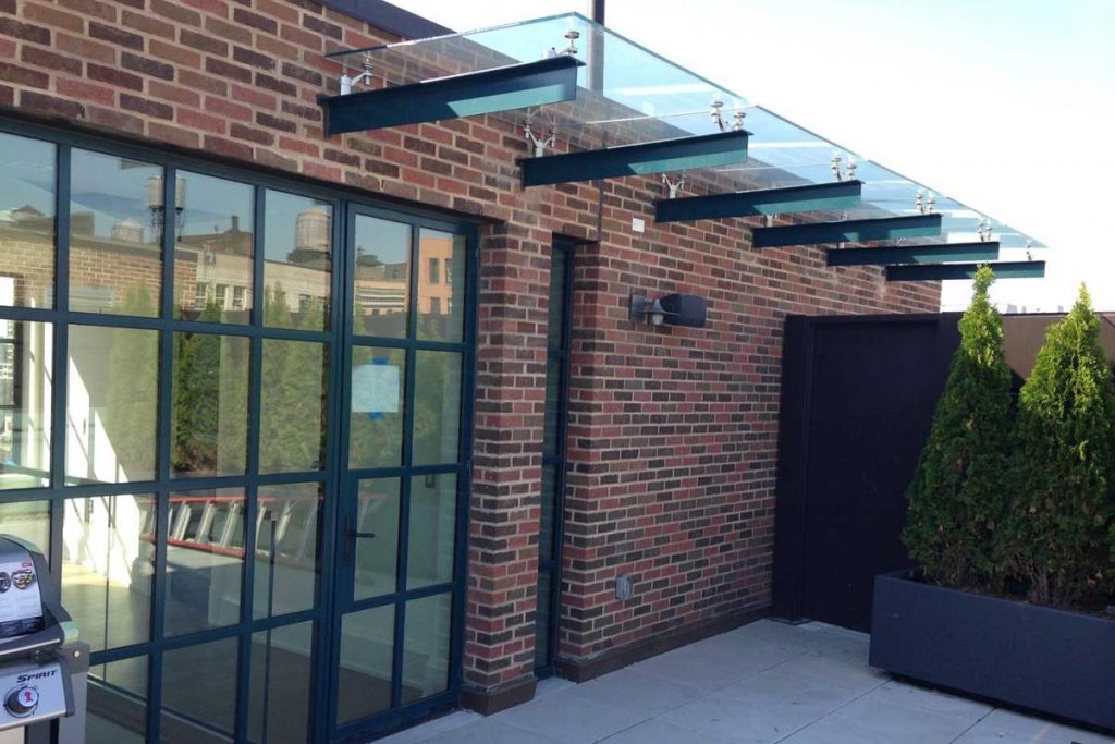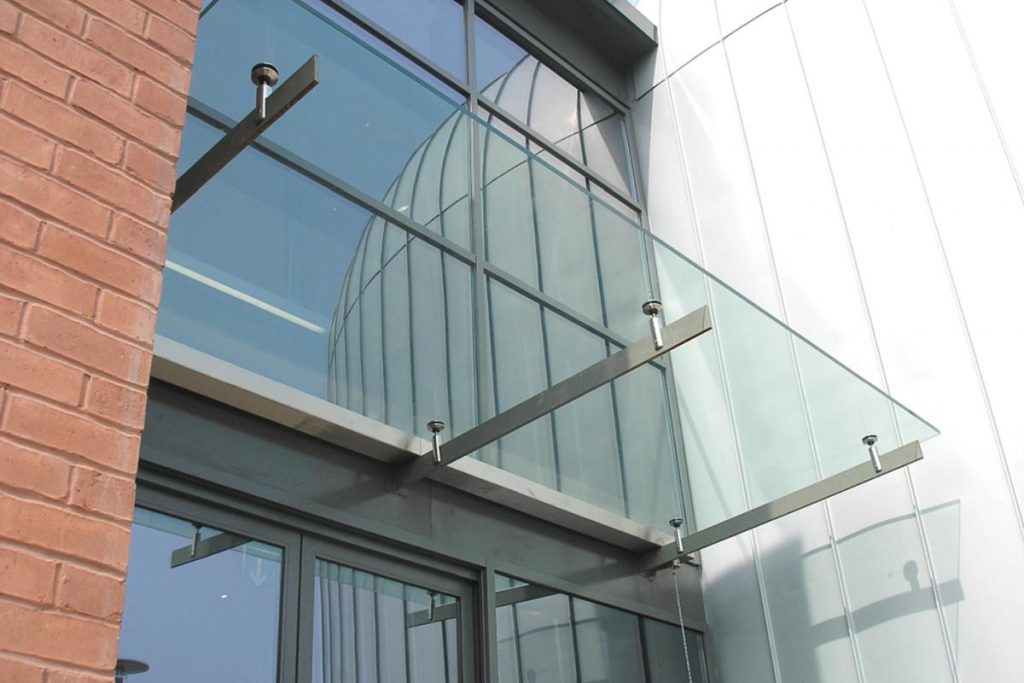 Если козырек не цельностеклянный, а на металлокарксе, он изготавливается из алюминия, конструкционной стали или нержавеющей стали. Как несущие конструкции используются подпорки, растяжки или кронштейны.